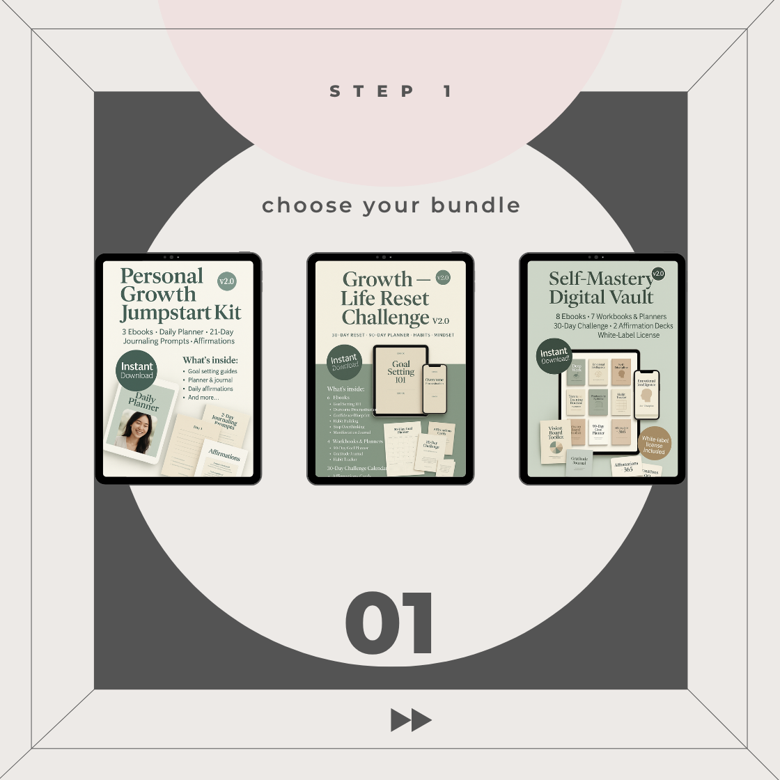 Jumpstart (quick wins), Life Reset (30–90 day system), or the Self-Mastery Vault (includes white-label rights). -